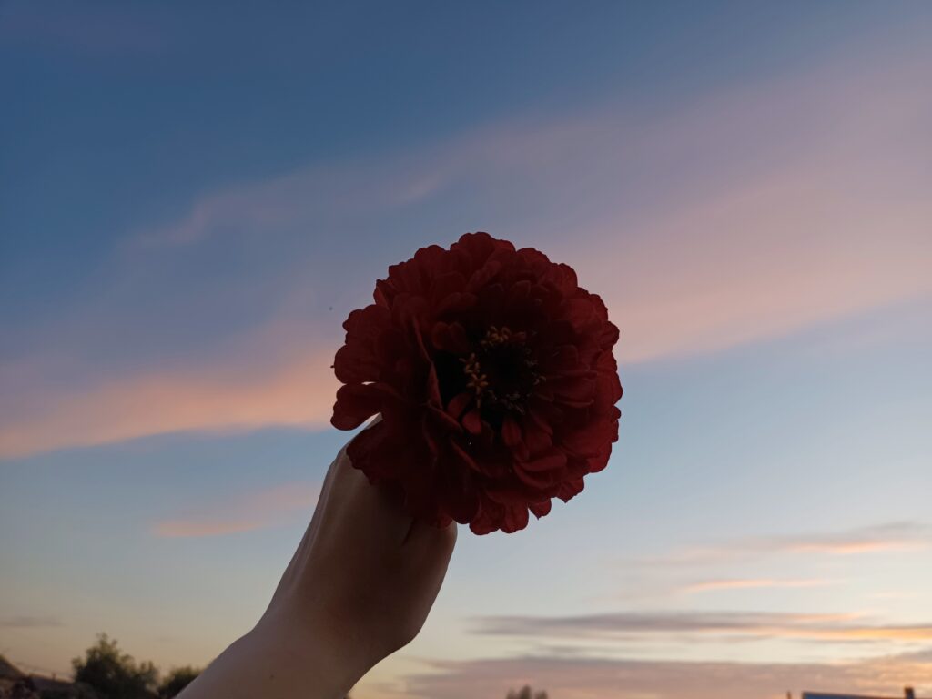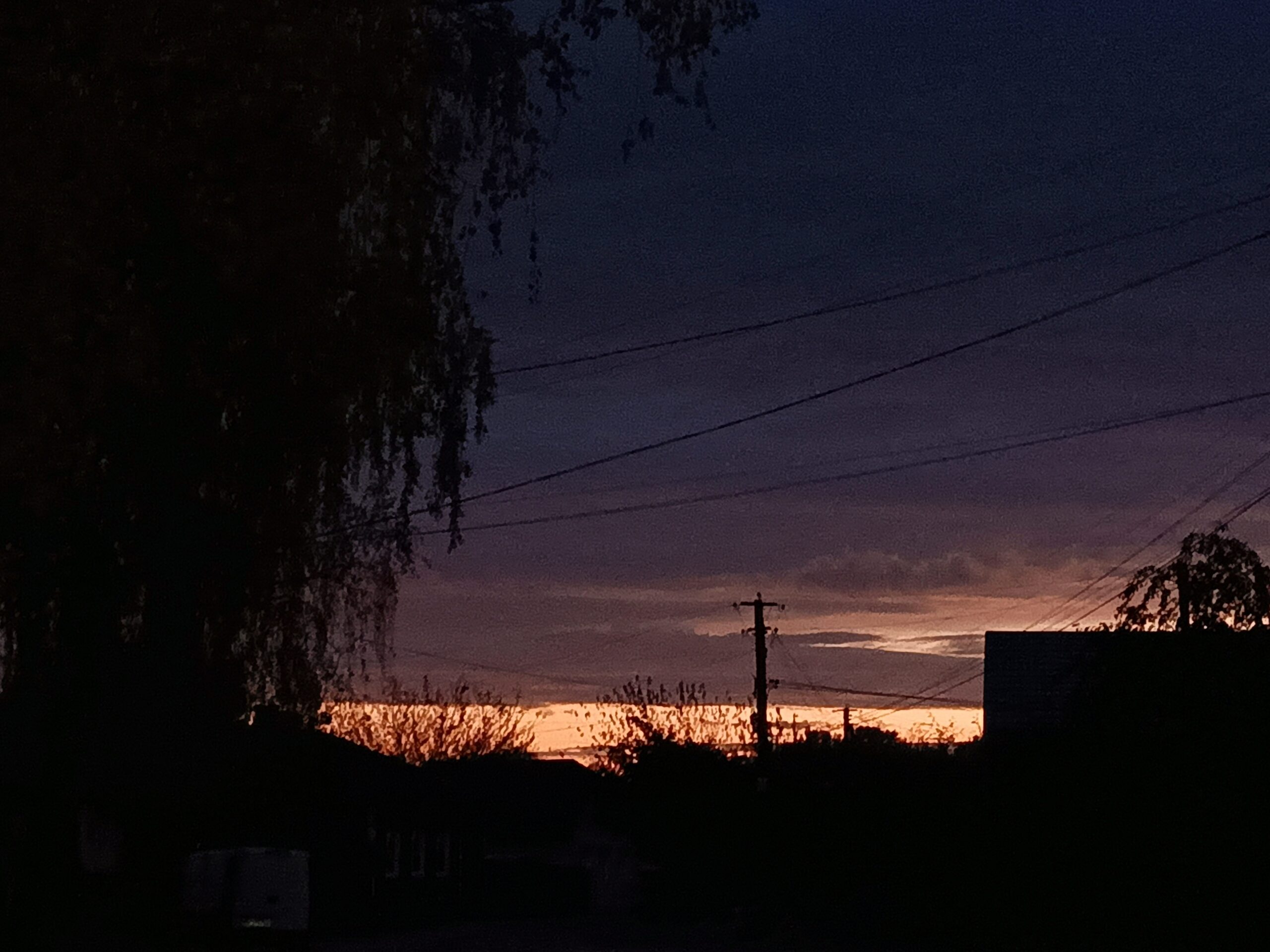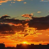Сонце спадає за горизонт, фарбуючи небо в теплі відтінки оранжевого та рожевого. Його останні промені розсіюються в хмарах, створюючи неймовірний пейзаж.